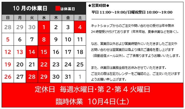■当店休業日は、自動返信メール以外のご返信およびお問合せの返信、 また出荷などの業務全般をお休みさせていただきます。 休業日中にいただいたご注文、お問合せにつきましては、翌営業日より対応させていただきます。 ご了承いただけますようお願いいたします。