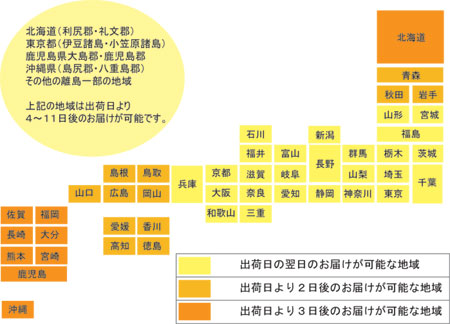 ※発送からお届けまでの日数は地域によって異なります。 発送からお届けまでの日数の目安は下記の図をご参考ください。