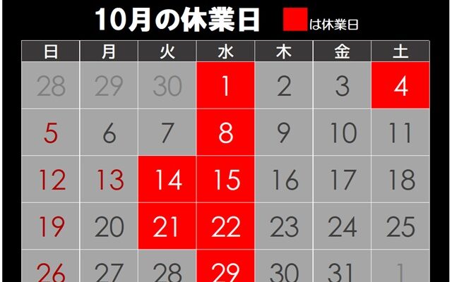 定休日の毎週水曜日、第2火曜日と 10月4日(土)と10月21日(火)を臨時休業いたします。