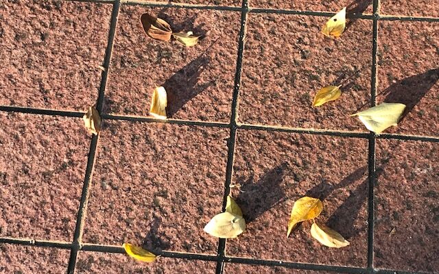 アスファルトの上に落ちている枯葉の上を